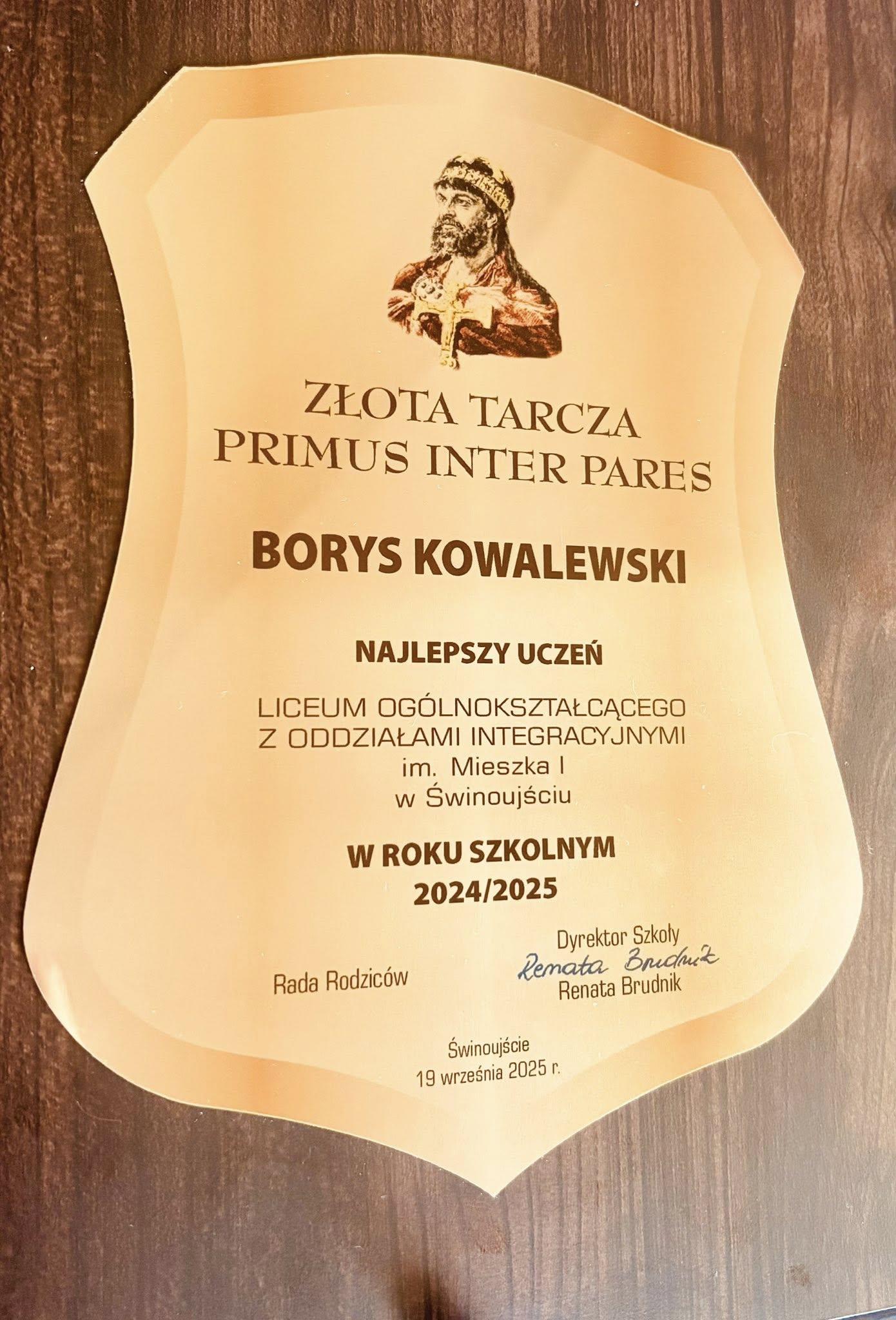 Pod koniec każdego roku szkolnego Rada Pedagogiczna spośród przedstawionych przez wychowawców kandydatów wybiera osobę, która zdobędzie niezwykle zaszczytny tytuł. Nazwiska tych osób są trzymane w tajemnicy aż do września następnego roku szkolnego, kiedy to zostają ogłoszone całej społeczności szkolnej podczas ceremonii obchodów Dnia Patrona. To właśnie podczas tej uroczystości bardzo dobremu i jednocześnie bardzo aktywnie w danym roku szkolnym zaangażowanemu w życie szkoły uczniowi wręczane jest odznaczenie obecnie, po zmianach, nazywane „Złotą Tarczą” i przyznawany jest tym samym szlachetny tytuł Primus Inter Pares. "Złotą Tarczę" przyznajemy od 30 lat! Co prawda, nagrody takie przyznawane były już znacznie wcześniej, bo od roku szkolnego 1968/1969 - nosiły tylko inną nazwę: najpierw była to odznaka "Czerwonej Tarczy z Laurem", potem "Czerwonej Tarczy", a od roku 1995 przyznajemy "Złotą Tarczę" - zatem możemy w tym roku mówić o swego rodzaju jubileuszu, a jubileuszową odznakę zdobył... BORYS KOWALEWSKI z klasy 4c!