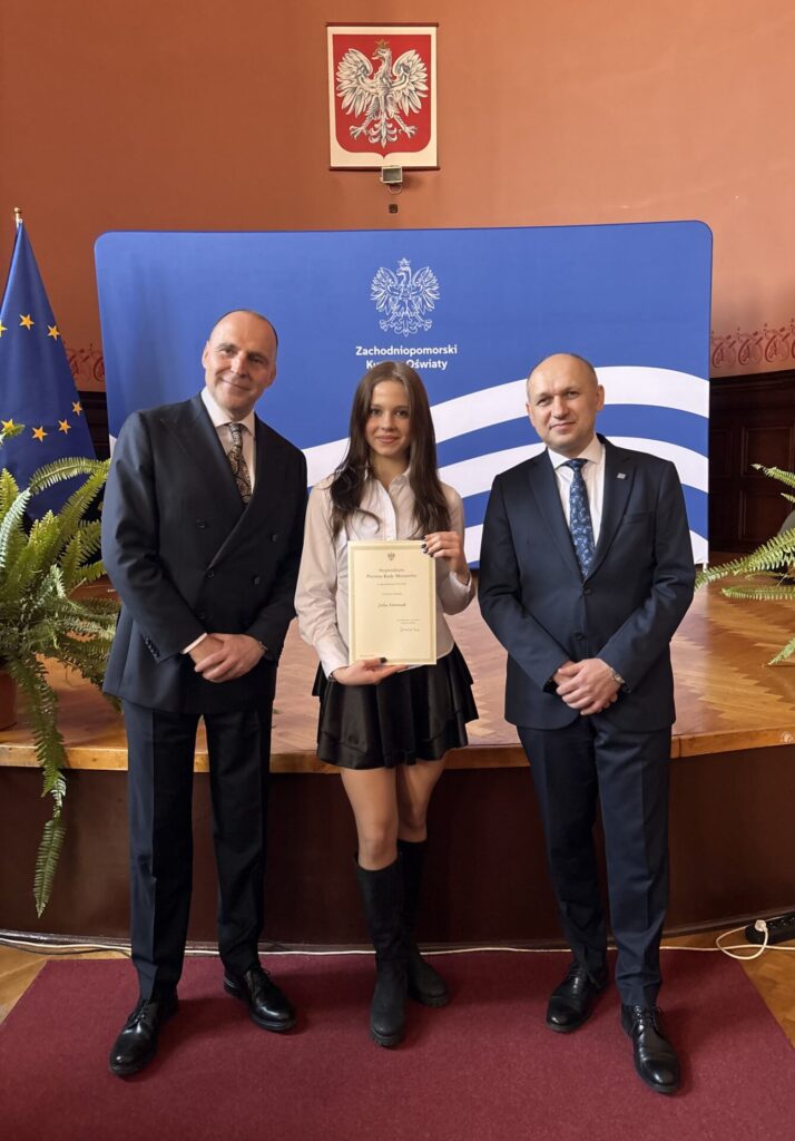 19 marca 2026 roku w murach I Liceum Ogólnokształcącego im. Marii Skłodowskiej-Curie w Szczecinie odbyła się wyjątkowa uroczystość. W blasku fleszy i w obecności Wojewody Zachodniopomorskiego Adama Rudawskiego oraz Zachodniopomorskiego Kuratora Oświaty Pawła Palczyńskiego, Julia odebrała dyplom potwierdzający jej wybitne osiągnięcia. To wyróżnienie przyznawane jest uczniom, którzy wykazują się najwyższą średnią ocen w szkole oraz szczególnymi uzdolnieniami.