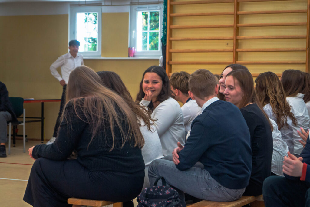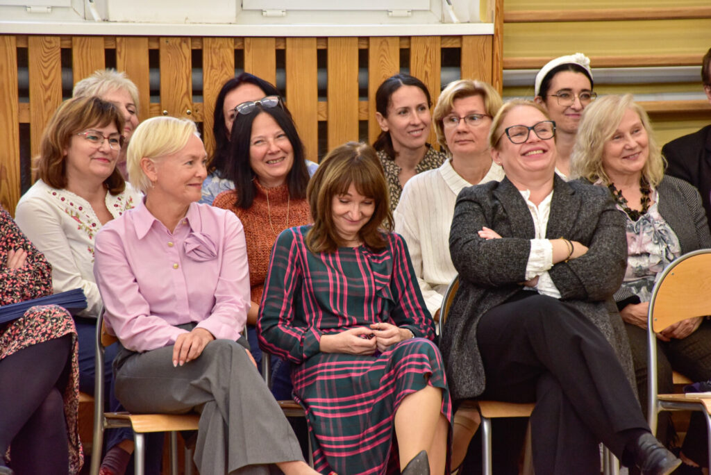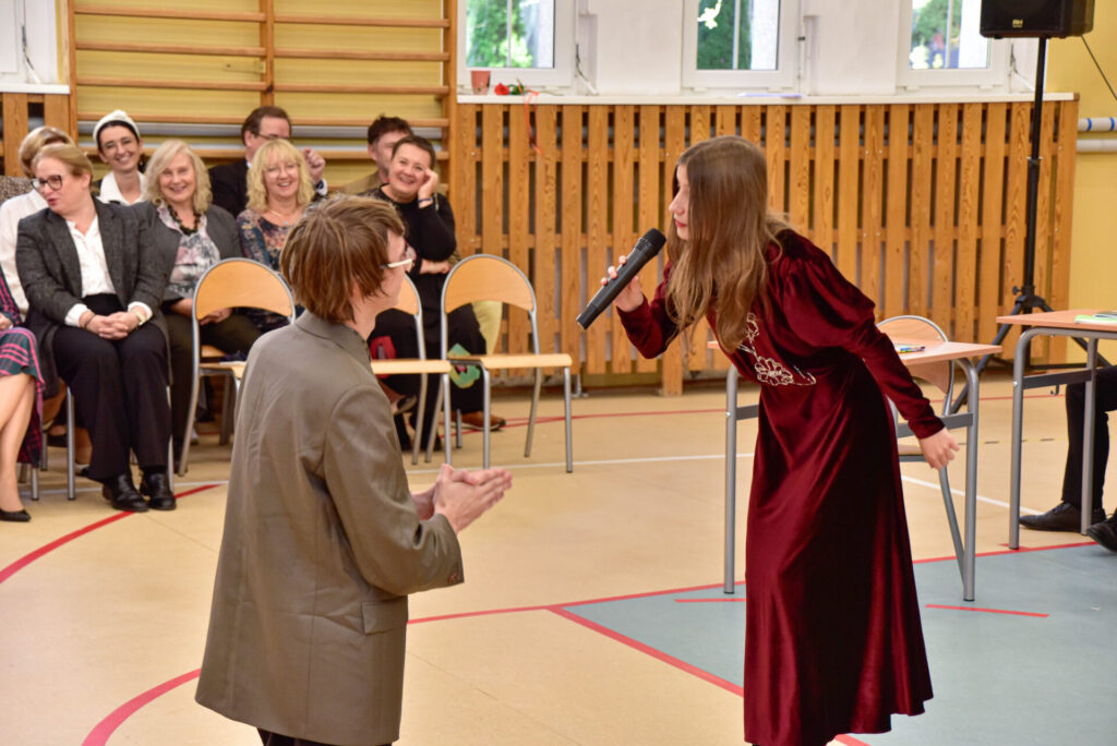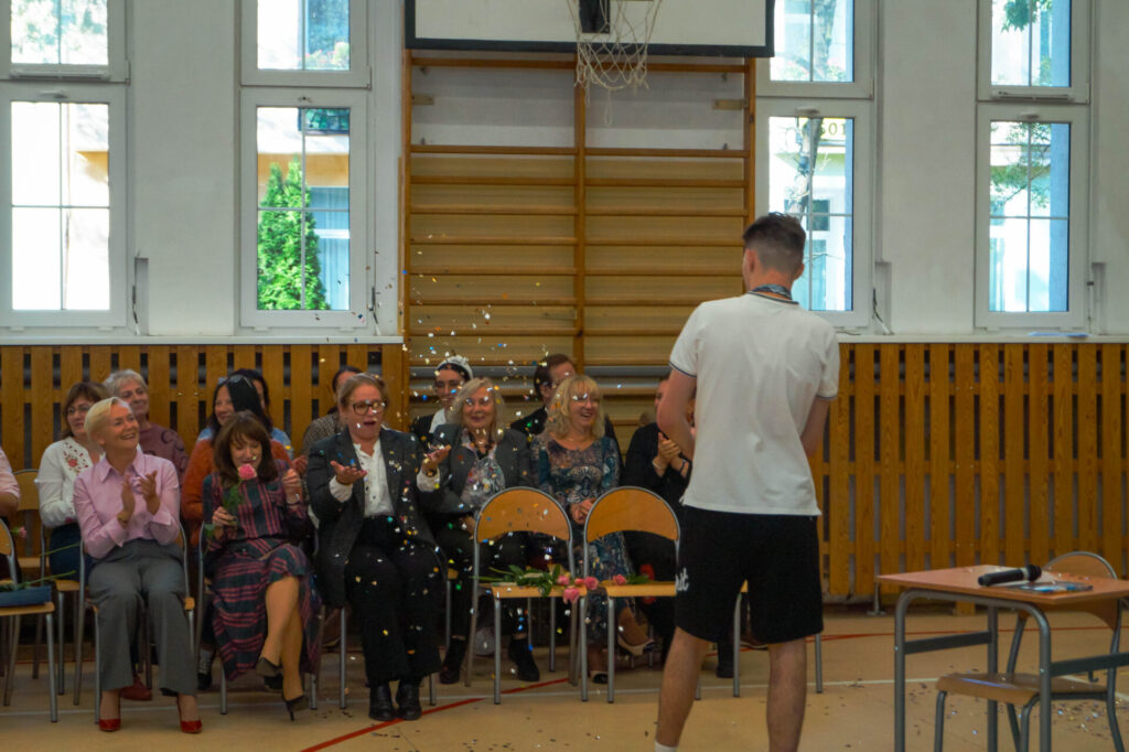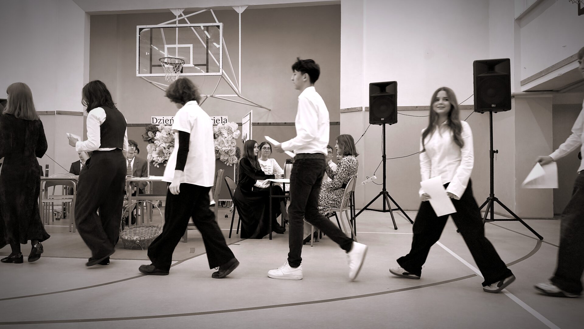 Życzenia dla władz miasta, emerytów i pracowników z okazji Dnia Edukacji Narodowej. Apel na wesoło z klasą 3E!