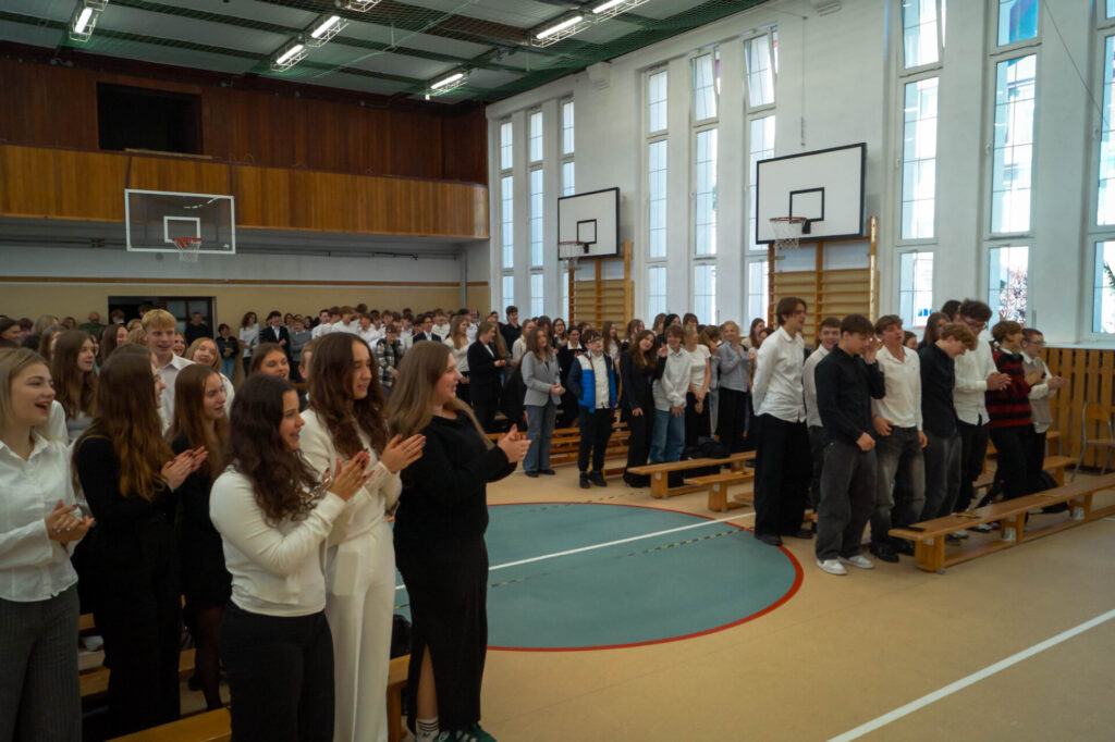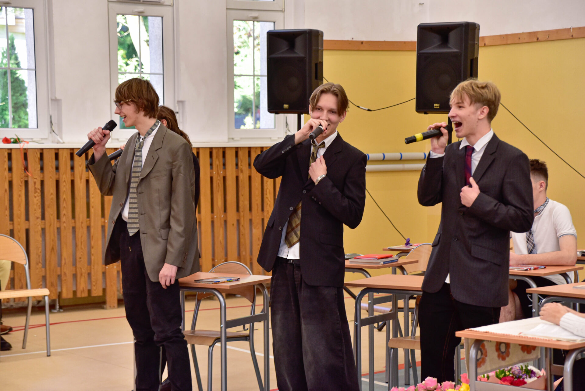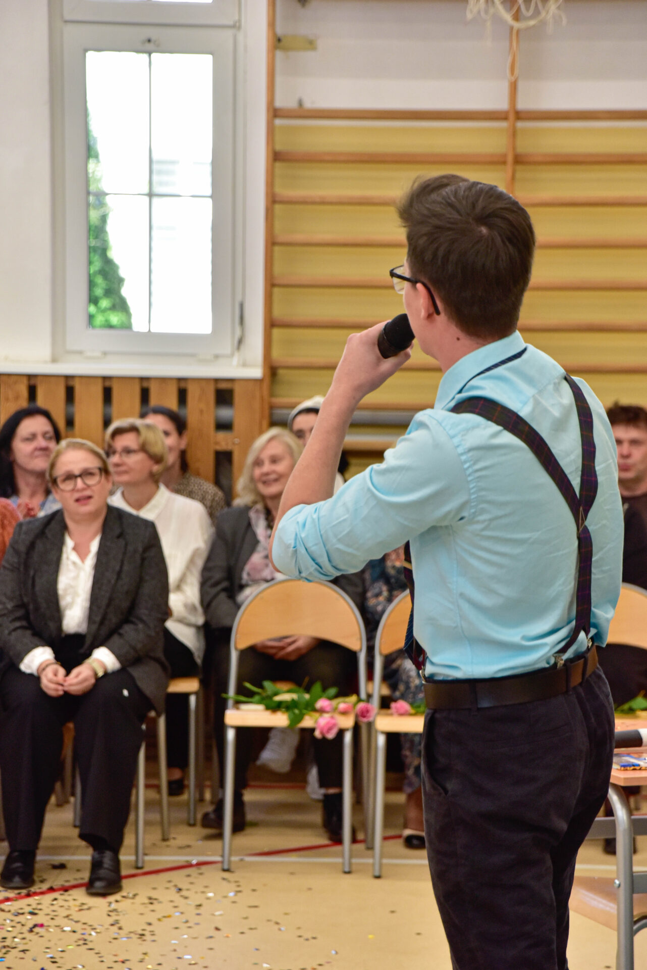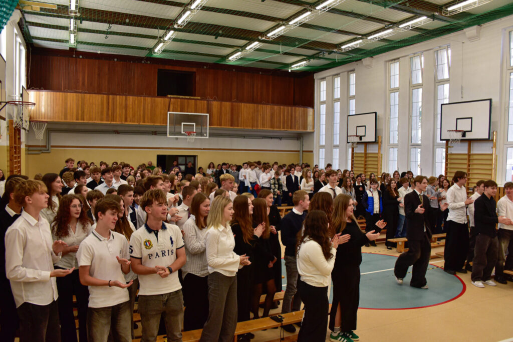 Życzenia dla władz miasta, emerytów i pracowników z okazji Dnia Edukacji Narodowej. Apel na wesoło z klasą 3E!