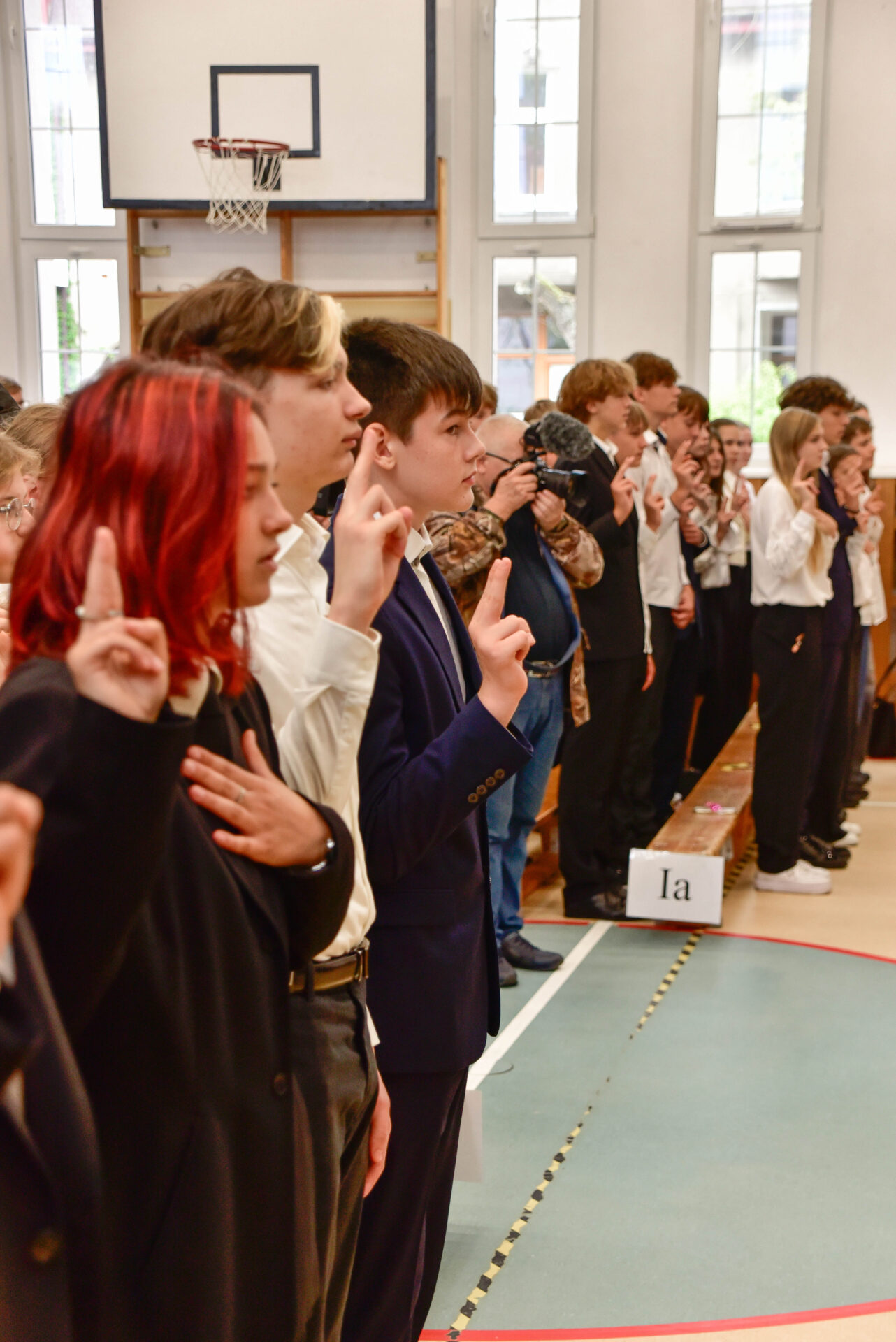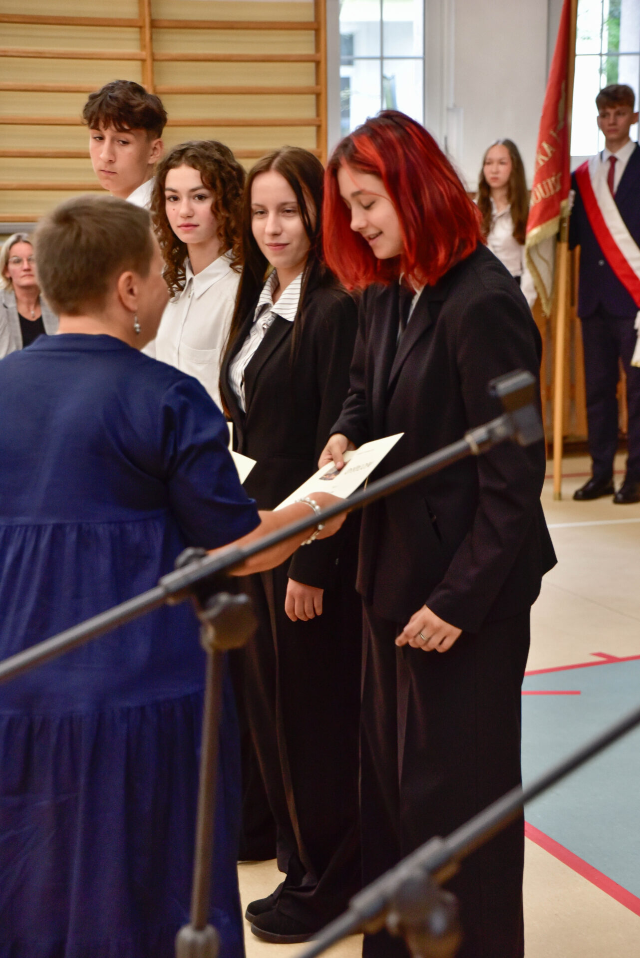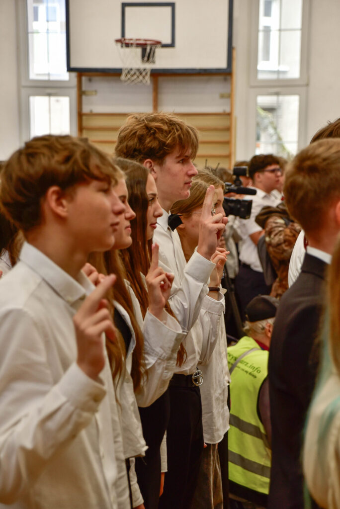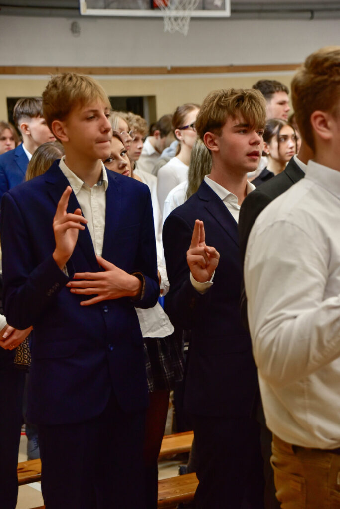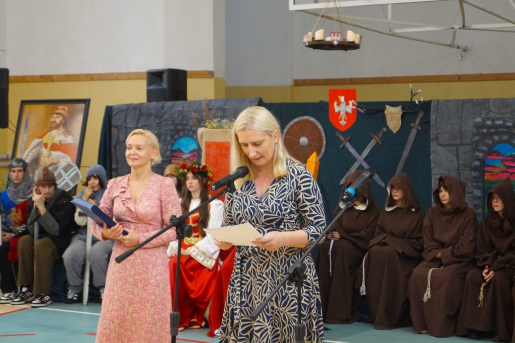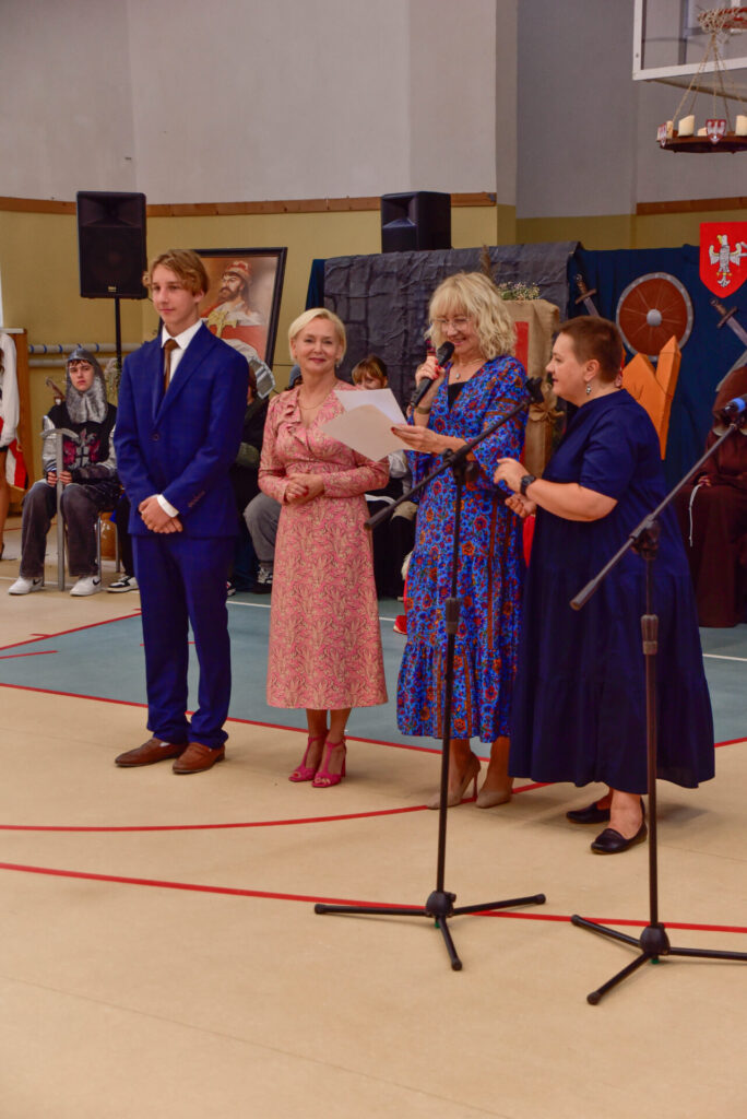 Rotę ślubowania odczytała Pani Dyrektor Renata Brudnik, a przyjęli wszyscy obecni na sali gimnastycznej, z gośćmi specjalnymi: