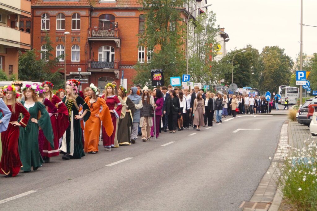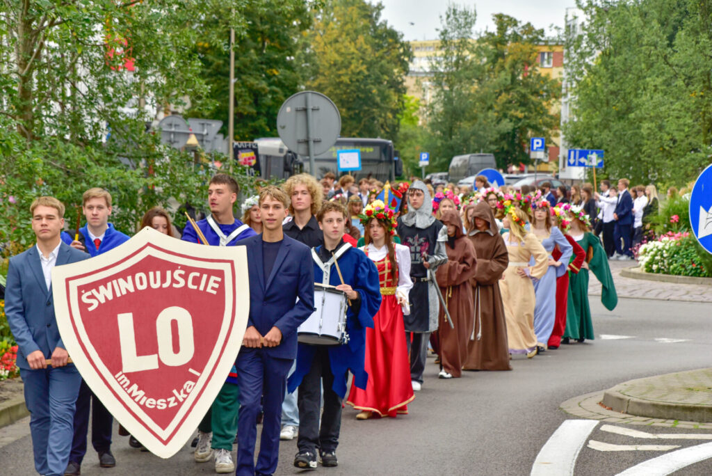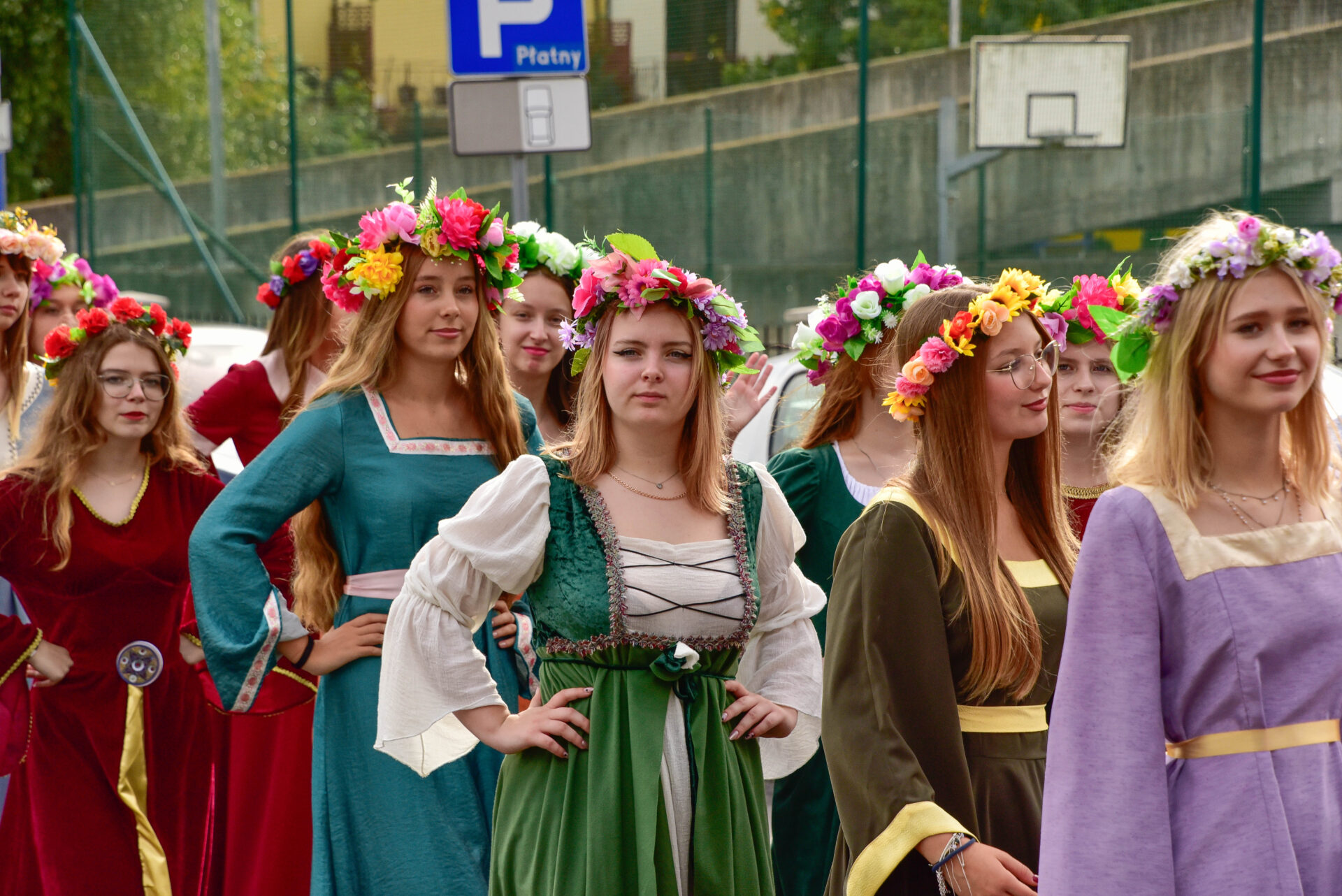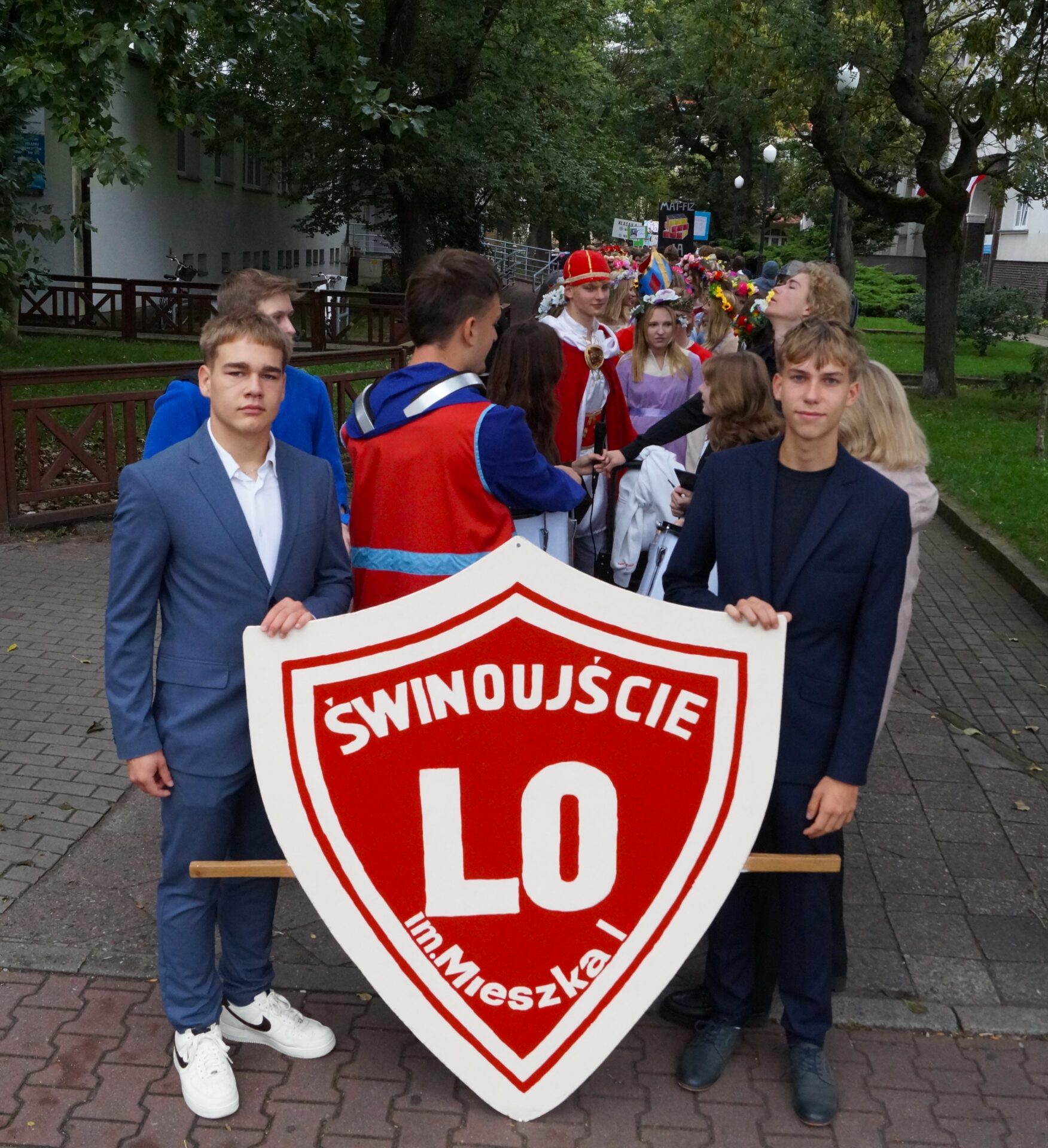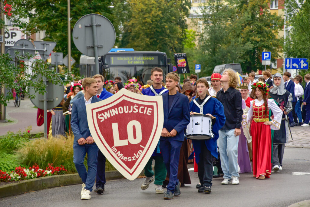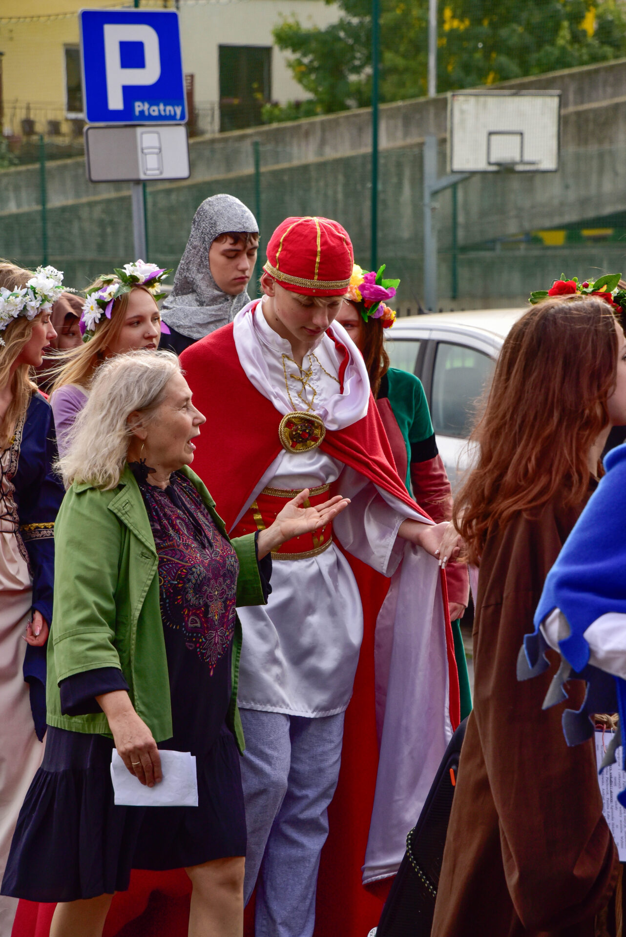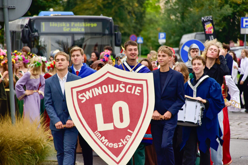 Chrzest Mieszka I na pewno miał miejsce w 966 roku. Po chrzcie Mieszka ochrzczono następnie jego dworzan i drużynę towarzyszących mu wojów. Za najbardziej prawdopodobne miejsce chrztu uznaje się Ostrów Lednicki koło Gniezna. Celebransem, który udzielał chrztu Mieszkowi, był Jordan, który przybył w 965 do nas roku w orszaku Dobrawy, a w 968 roku ustanowiony został pierwszym biskupem w Polsce. Co roku na pamiątkę tych kluczowych w historii naszego kraju wydarzeń maszerujemy przez miasto nie tylko prezentując "świtę Mieszka i Dobrawy", ale przy okazji z dumą informując o osiągnięciach naszej szkoły.