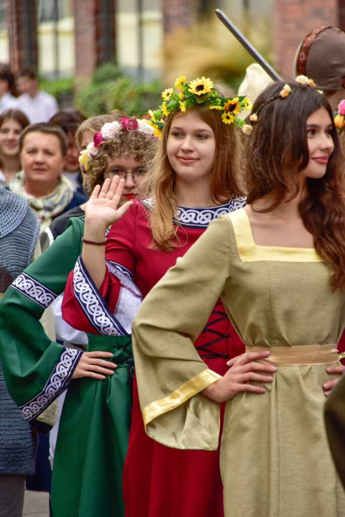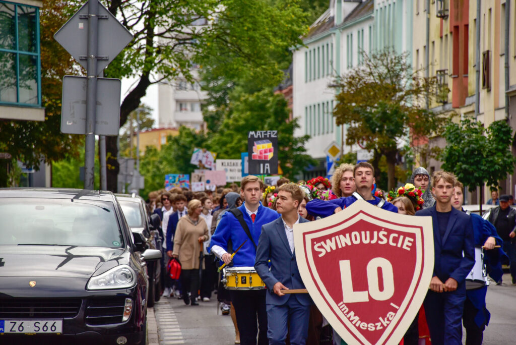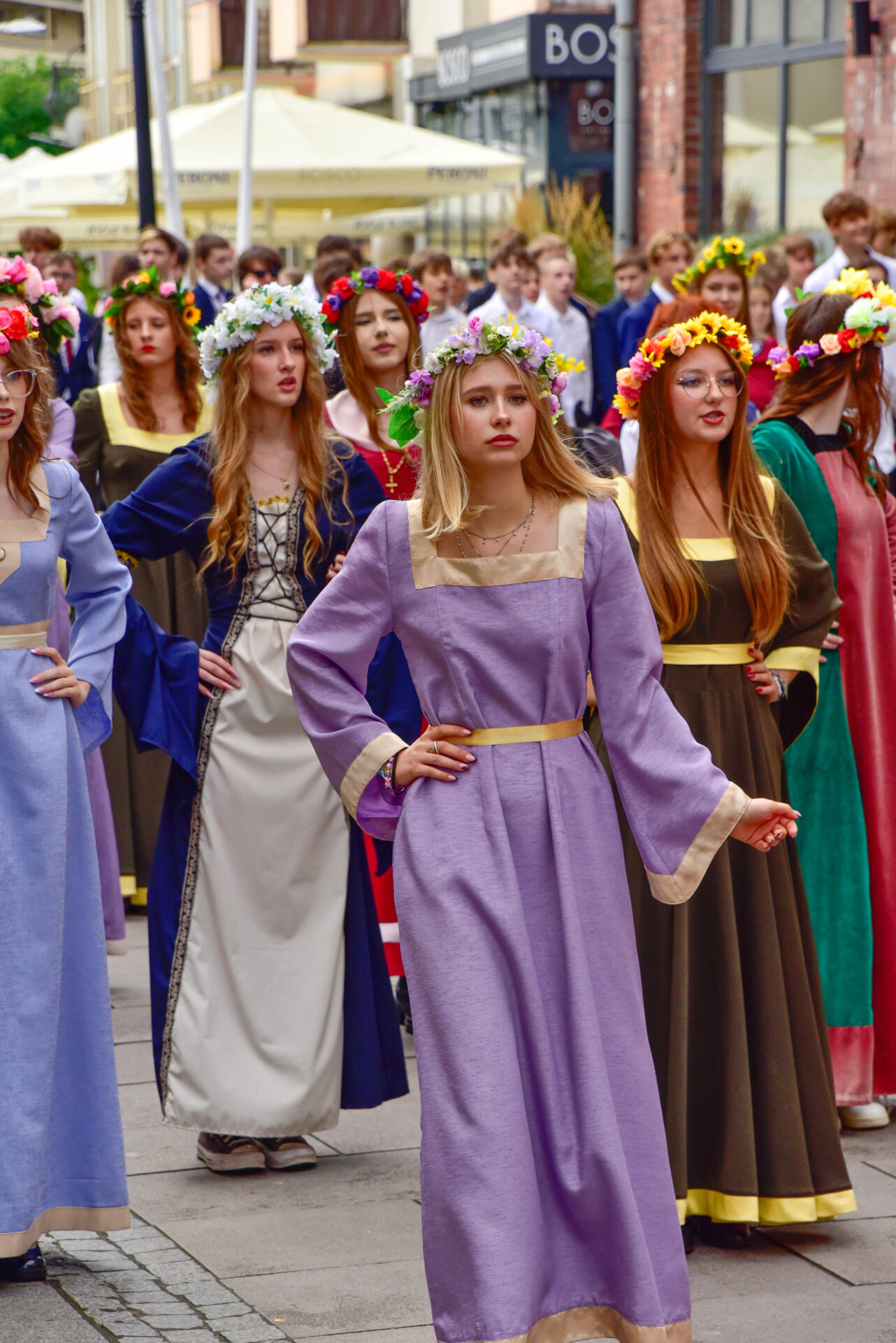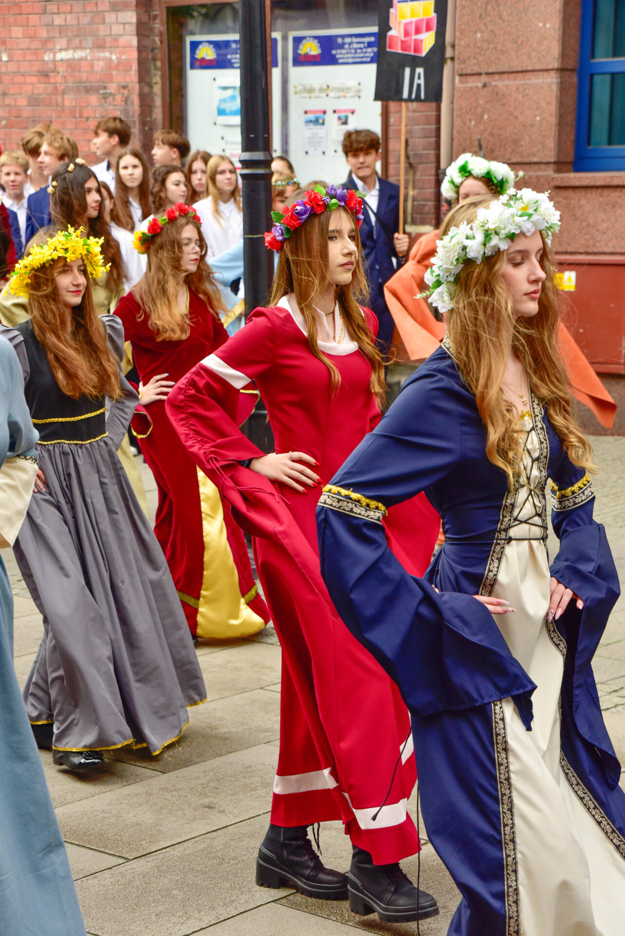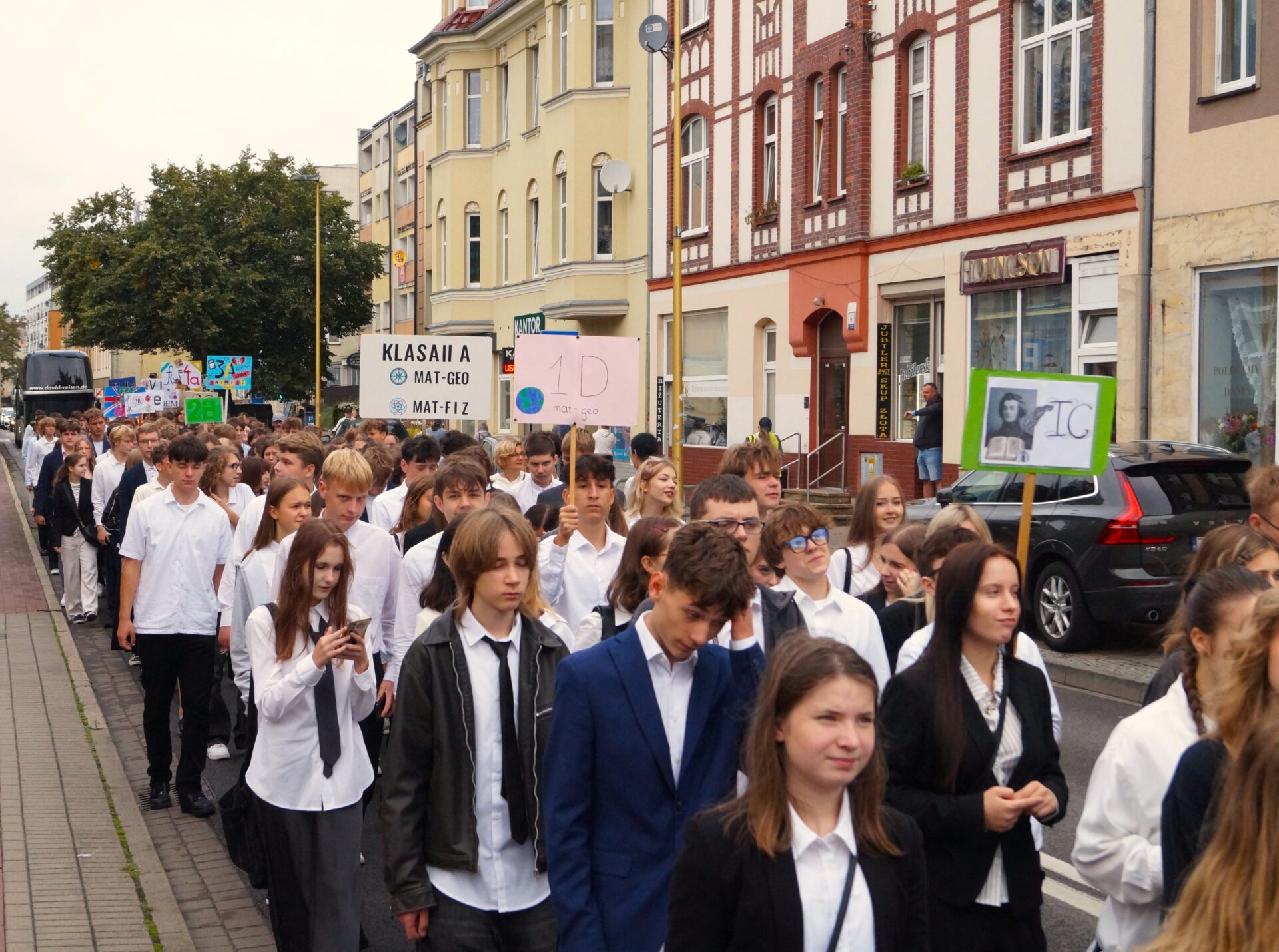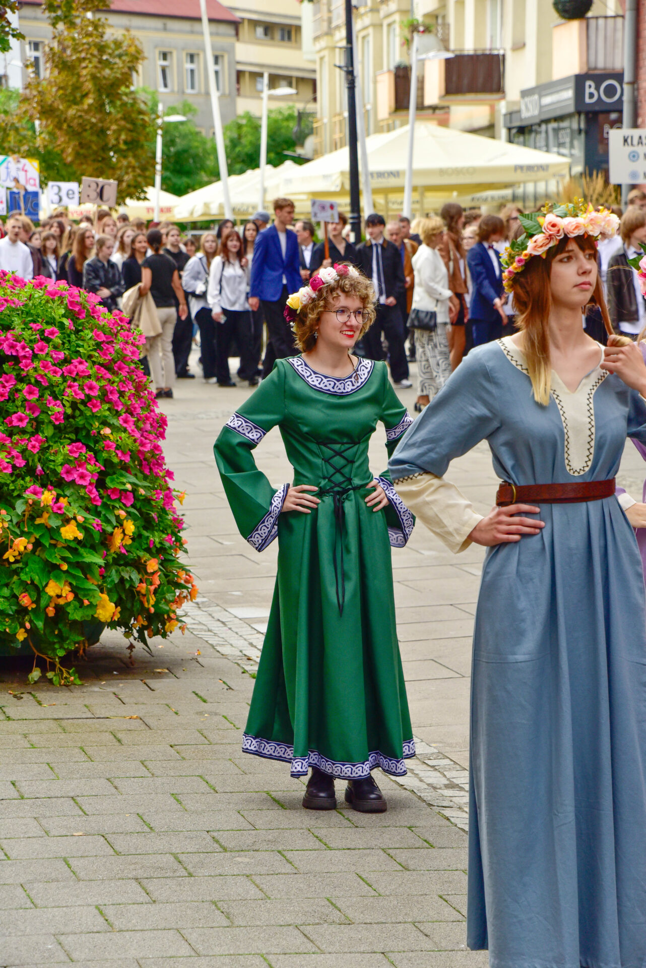 Chrzest Mieszka I na pewno miał miejsce w 966 roku. Po chrzcie Mieszka ochrzczono następnie jego dworzan i drużynę towarzyszących mu wojów. Za najbardziej prawdopodobne miejsce chrztu uznaje się Ostrów Lednicki koło Gniezna. Celebransem, który udzielał chrztu Mieszkowi, był Jordan, który przybył w 965 do nas roku w orszaku Dobrawy, a w 968 roku ustanowiony został pierwszym biskupem w Polsce. Co roku na pamiątkę tych kluczowych w historii naszego kraju wydarzeń maszerujemy przez miasto nie tylko prezentując "świtę Mieszka i Dobrawy", ale przy okazji z dumą informując o osiągnięciach naszej szkoły.